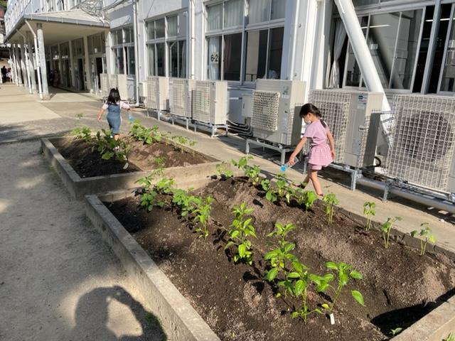 大きく育ってね! 朝か2年生の学習畑で、子どもたちが野菜の苗に一生懸命水やりをしていました。ピーマンにナス、ミニトマトと育てています。先日紹介したミニトマトと…