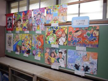 | 職員室前では「子ども県展」で入選・特選になった作品を展示しています。 |