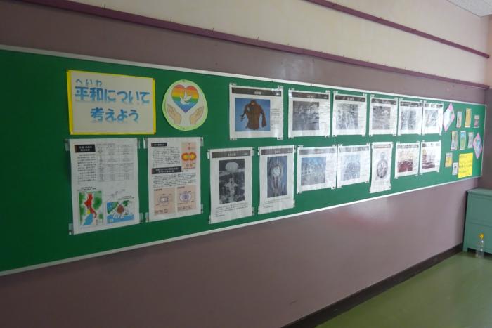 平和について考えよう 図書室前の渡り廊下の掲示板には、平和について考えるコーナーが設けられています。広島・長崎に落とされた原爆についてデータや写真が掲示されていま…