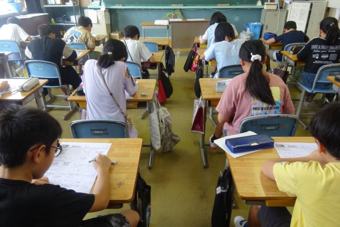 力だめし 5年生は、算数の力だめしのプリントを解いていました。1学期に学習したことが定着しているかをみるプリントです。