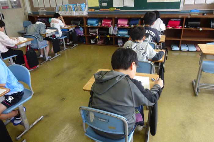 学力調査 今日は6年生が全国、5年生が県の学力調査を受検しました。2学年とも自分の実力を発揮すべく一生懸命問題を解いていました。