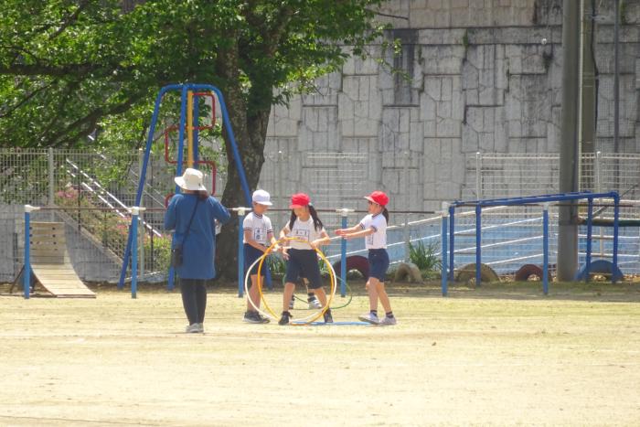 晴れ渡った空の下で 4年生は、素晴らしい晴れ渡った空の下で元気に体育の学習をしていました。ボール運動やブランコ、フラフープなどを使って体を存分に動かしていました…