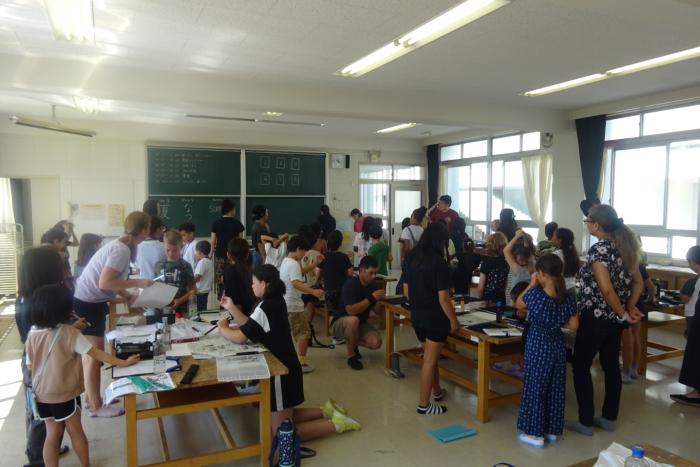 エレメンタリースクールとの交流 今日は、エレメンタリースクールの幼稚園から5年生までを本校にお招きして、本校3年生が6つのグループに分かれて、作品の台紙づくり、毛筆の作品づ…