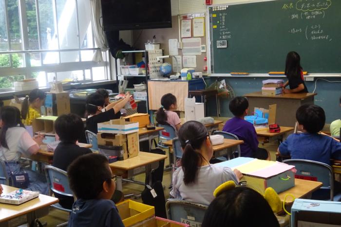 作品発表会 4年生は図工の時間につくった「ダンボールボックス」の作品発表会を行っていました。「形や仕組み」「工夫しところ」「がんばったところ」「うまくい…