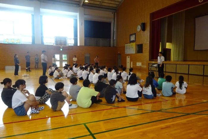6年生中学校生活開始 今日から6年生は中学校舎に登校となりました。いよいよ中学校生活の開始です。今日は光海中学校の全校生徒、先生方に集まっていただき対面式を開いて…