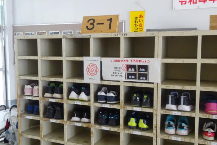 くつばこ 毎朝子どもたちが登校した後は集中下足室を訪れています。靴がよく並んでいた学級には花丸カードをおいています。今日は3年生が花丸でした。すべては…