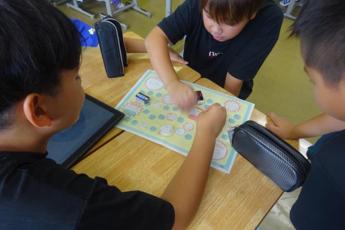夏休み明けすごろく 5年生の教室をのぞいてみると、「夏休み明けすごろく」をしていました。4人グループになり、夏休みの思い出や2学期に向けてのお題が各マスに書いて…