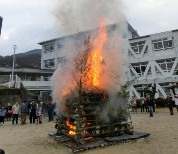 鬼火焚き 西地区自治協議会主催の鬼火焚きを本校運動場で行いました。地域の皆様を含め200名を超す参加者でにぎわい、たくさんの煙を浴びて、七草がゆを食し…