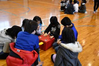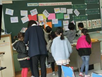 英語集会 「福笑い」ではなく「鬼笑い」を縦割り班の仲間と協力して行いました。「eyes」「mouth」[eyebrows」など英語を使って会話をしなが…