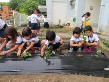 芋さし 1年生が芋さしをしました。秋の収穫が楽しみです!