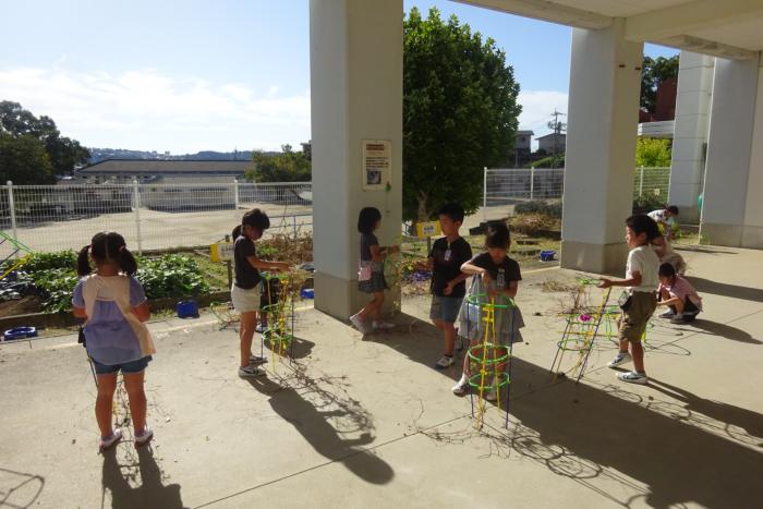 1年生は、ずっと育てていた朝顔の茎をプランターから外す作業をしていました。毎日水やりをして心を込めて育ててきた朝顔。植物への愛情も育ってきています。