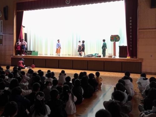 今年度最後のかがやきタイムは、演劇クラブによる劇の発表でした。演目は「浦島太郎」です。メンバーそれぞれが持ち味を発揮して、楽しい劇になっていました。見ている全校のみんなの顔がニコニコ笑顔になりました。昼休みも返上して練習をがんばった演劇クラブの皆さんに感謝です!!