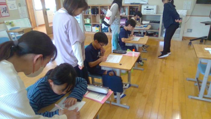 第1回 授業参観 授業参観が行われています。5・6年複式で国語の授業を行っています。もとの漢字に一本線を書き加えることで異なる漢字にするという課題に保護者の…