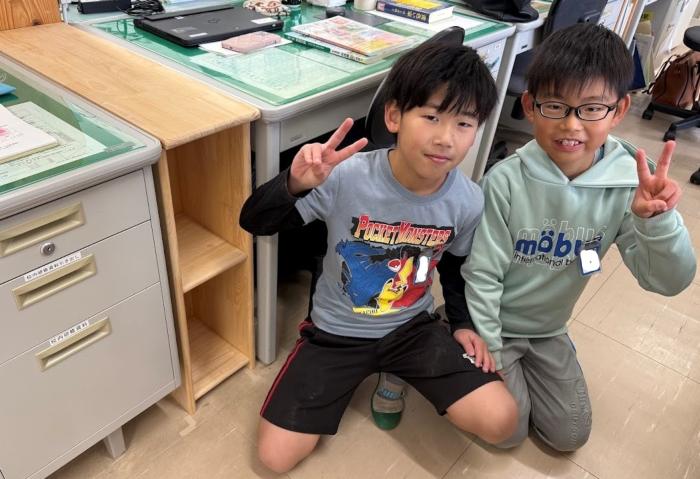 前期課程の児童が先生方のために棚を作ってくれました。写真の左の方にあるのがそれです。後期課程の教頭先生にご指導をあおぎなから一生懸命に製作しました。あとはニス塗をして完成です。