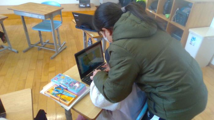 1年生が休み時間にタイピング練習をしていました。それを見ていた5年生が優しくサポートしてくれました。姉妹みたいに仲が良くていいですね。