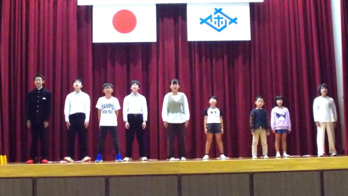 全校児童生徒による「私たちぼくらの島」の合唱を披露しました。以前本校にお勤めになられた先生が作ってくださった黒島愛にあふれた曲です。みんなで島民の皆さんへの感謝の気持ちを込めて一生懸命歌いました。