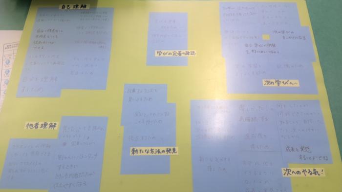 昨日の校内研修で先生方が「振り返りがもたらす効果」について考えた意見を研究主任の先生がグルーピングしました。すばらしい成果物です。みんなで意識していこうと思います。