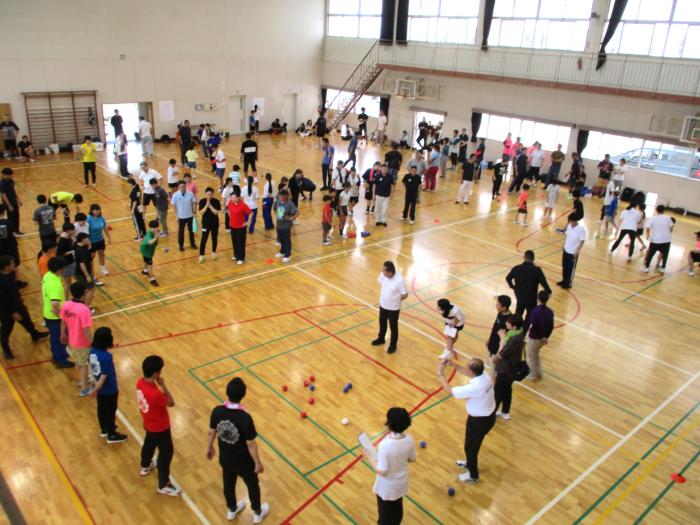 ボッチャで楽しみました! 6月28日(土)、本校体育館にて「東部ブロックPTA交流会」が行われました。今年は、けがの心配が無く、みんなが楽しく活動できる「ボッチャ」…