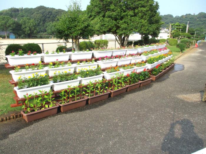 たくさんのお花でお出迎え! 玄関前の雰囲気が少し変わりました。たくさんの花が棚に飾られています。これらの花は学校管理員の山下さんが種から育てられました。マリーゴールド…