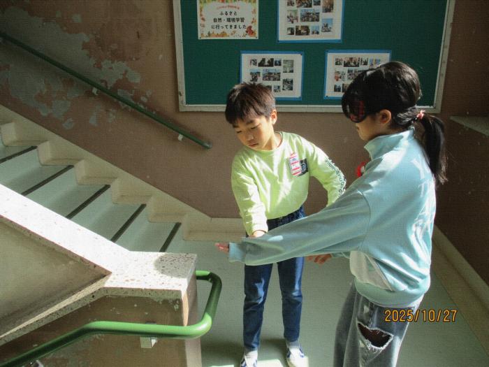 相手に寄り添って「アイマスク体験」 27日(月)、社会福祉協議会の近藤様をお迎えし、「福祉体験学習」の一環としまして「アイマスク体験」を4年生が行いました。二人一組になって、…