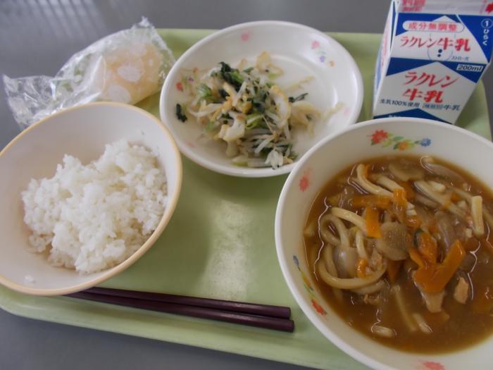 5/30(金)今日の給食 牛乳 ごはん(少なめ) カレーうどん