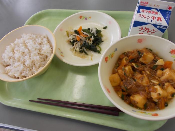 6/3(火)今日の給食 牛乳 麦ごはん マーボー豆腐 中華あえ