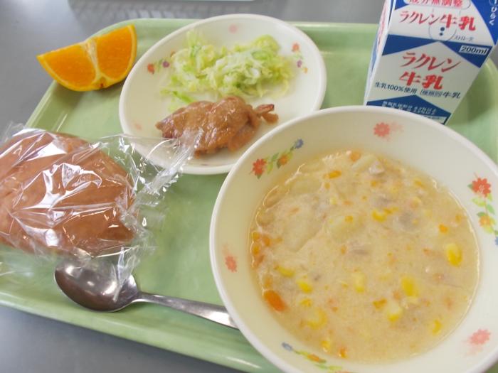 6/9(月)今日の給食 牛乳 パーカーハウスパン 豆乳のポタージュ 照焼きチキン ゆでキャベツ オレンジ