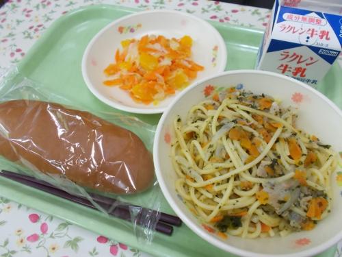 6/12(木)今日の給食 牛乳 黒砂糖パン 青じそスパゲティ キャロットサラダ