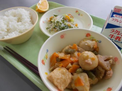 6/26(水)今日の給食 牛乳 ごはん 厚揚あげと野菜のうま煮 春雨の酢の物 オレンジ
