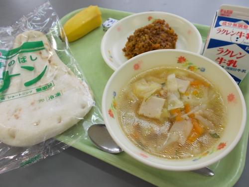 6/27(木)今日の給食 牛乳 ナン わんたんスープ キーマカレー バナナ 角チーズ