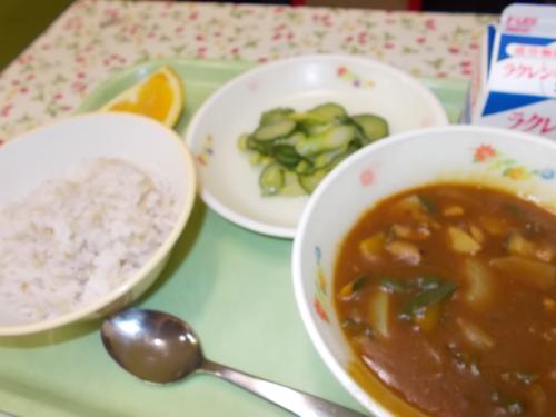 7/3(水)今日の給食 牛乳 夏野菜カレー(麦ごはん)アスパラサラダ オレンジ
