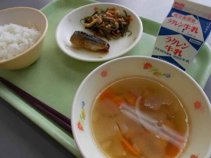 7/9(火)今日の給食 牛乳 ごはん 冬瓜の吸い物 さんま甘露煮 クーブイリチー