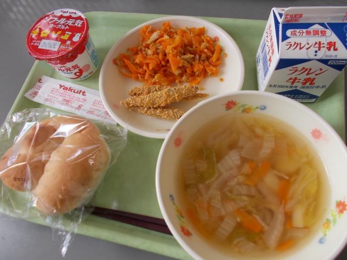 牛乳 はちみつパン はくさいスープ きびなごのカリカリフライ にんじんしりしり ヨーグルト