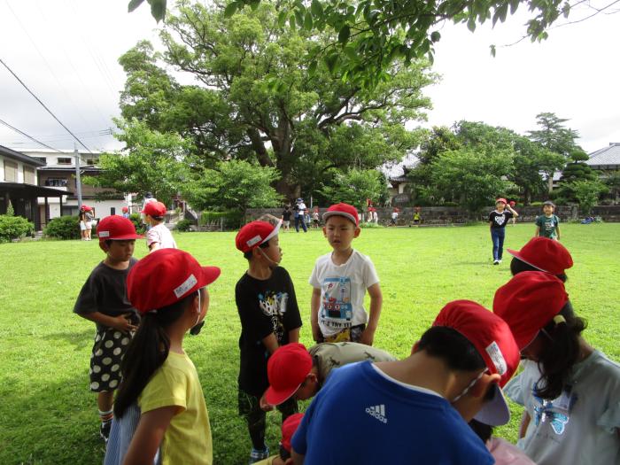 東漸寺の広場で思いっきり身体を動かしながら生き物や草花を観察しています。
