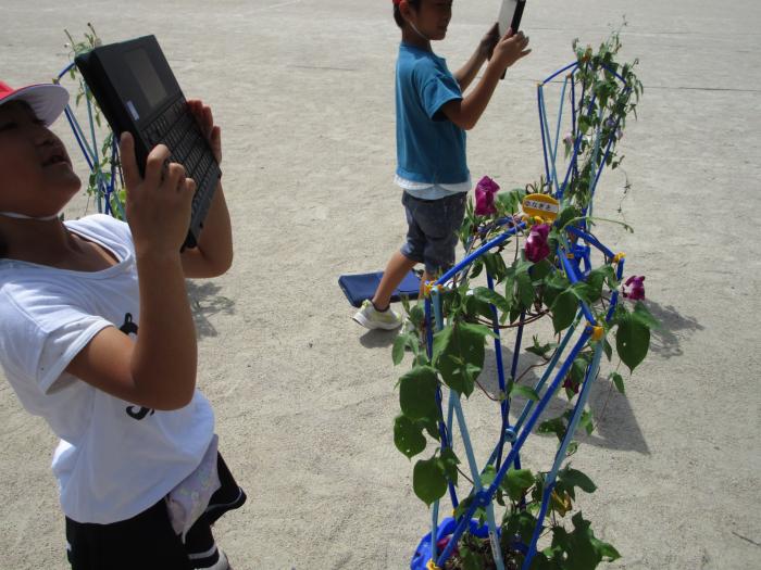 1年生の皆さんが朝顔を写真に収めようとタブレットを使いこなしています。1学期の間に自分でログインしてカメラ機能を使う力を身に付けたようです。朝顔も期待に応えようとしているようです。