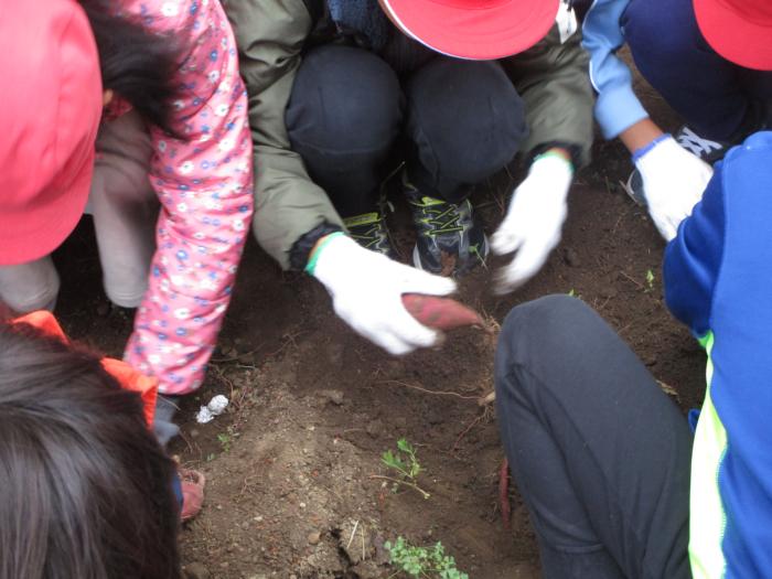 2年生の皆さんが畑に入って楽しそうに「いもほり」をしています。そう、梅雨に入る前に植えたさつまいもの収穫の日です。皆、一生懸命に土を掘り起こしていますが・・・どうだったのでしょう?