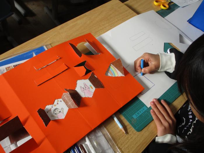 2年生のみなさんが楽しそうな作品づくりに取り組んでいます。切り抜いた窓に合わせていろいろな素敵な絵を描いているようですね。窓を開けるとどんなものが待っているのでしょうか。
