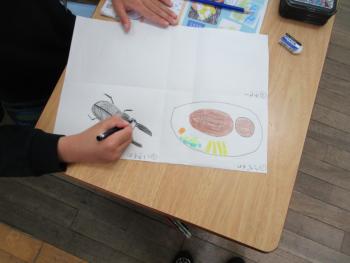3年生の教室をのぞくと、おいしそうなハンバーグが描かれていました。みんな、自分が好きな季節や、好きな食べ物などを、思い思いに描いています。