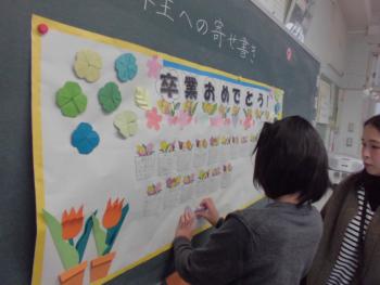 卒業式に向けて 4年生の教室では、6年生にメッセージを書いて模造紙に貼る活動をしていました。他学年も4年生と同様に18日にの卒業式に向けて、今までお世話に…