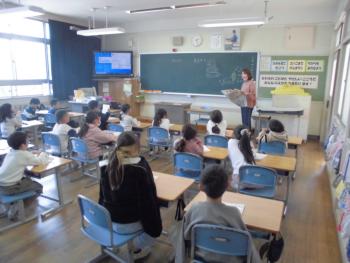 丸付け先生ありがとう 毎週水曜日の朝の時間はチャレンジタイムです。1年生と2年生の教室には、丸付けボランティアの2人の先生が来てくださいます。今日は今年度最後の丸…