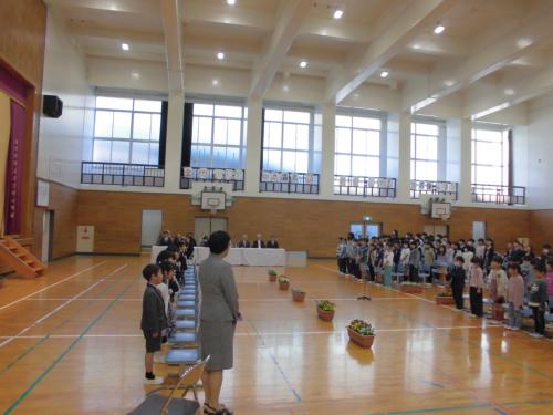 町別児童会・縦割り活動 4月11日(木)、今日は朝から体育館に全児童が集まり、町別児童会と縦割り活動班の顔合わせを行いました。