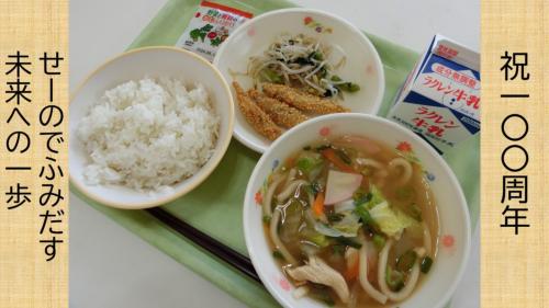 10/13(金)今日の給食 ぎゅうにゅう ごはん ごもくうどん きびなごカリカリフライ もやしのいためもの ふりかけ