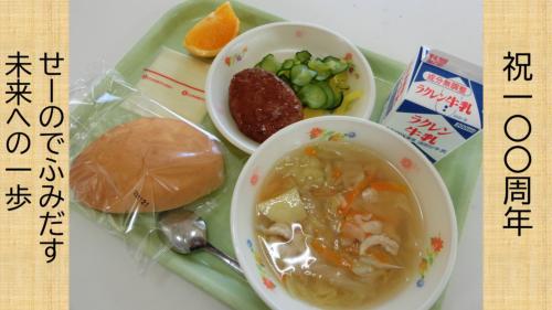 11/22(水)今日の給食 ぎゅうにゅう パーカーハウスパン ポテトとキャベツのスープ にこみハンバーグ ゆでやさい オレンジ スライスチーズ