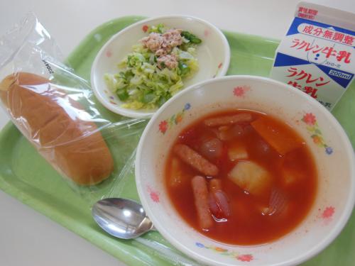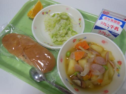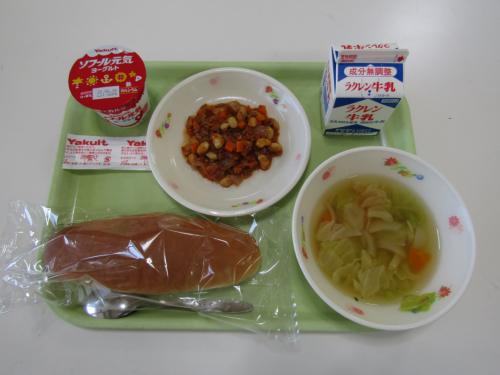 6/8(水) 今日の給食 コッペパン、牛乳、コンソメスープ、チリコンカーン、ヨーグルト