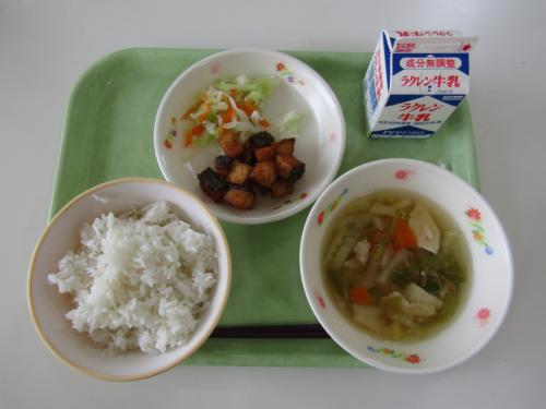 6/16(木) 今日の給食 ごはん、牛乳、やさいわん,魚のバーベキューソース,塩もみ野菜