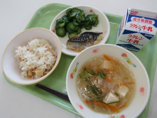 4/20(木)今日の給食 ぎゅうにゅう たけのこごはん はるさめじる さばのしおやき ゆかりあえ