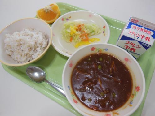 5/18(木)今日の給食 ぎゅうにゅう ハヤシライス(むぎごはん) コールスローサラダ あまなつ