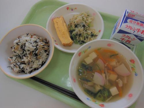 6/16(金)今日の給食 ぎゅうにゅう ひじきごはん はるさめじる あつやきたまご ごまあえ