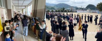 例年とはちがい、今日は在校生による出迎えをしました。6年生は在校生に出迎えをしてもらいな…