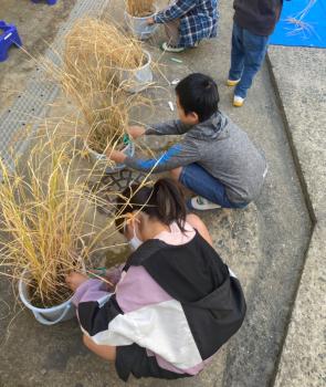バケツ稲 今朝、バケツ稲の稲刈りをしてくれていました。このバケツ稲は、健全育成会の花育活動からいただいたものです。バケツと言えどもちゃんと稲穂が実って…